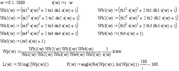 Коэффициенты ai, bi полиномов числителя и знаменателя передаточной функции Wp(s) выражаются через параметры элементов модели следующим образом: (8) a9=J1J2J3J4J5 a8=D01J2J3J4J5+D12J3J4J5(J1+J2)+J1(D23J4J5(J2+J3)+J2(D34J5(J3+J4)+D45J3(J4+J5))) a7=C01J2J3J4J5+C12J3J4J5(J1+J2)+C34J1J2(J3J5+J4J5)+C45J1J2J3(J4+J5)+D01(D12J3J4J5+D23J4J5(J2+J3)+J2(D34J5(J3+J4)+D45J3(J4+J5)))+D12(D23J4J5(J1+J2+J3)+(J1+J2)(D34J5(J3+J4)+D45J3(J4+J5)))+J1(D23(D34J5(J2+J3+J4)+D45(J4+J5)(J2+J3))+D34D45J2(J3+J4+J5)) a6=C01(D12J3J4J5+D23J4J5(J2+J3)+J2(D34J5(J3+J4)+D45J3(J4+J5)))+C12(D01J3J4J5+D23J4J5(J1+J2+J3)+(J1+J2)(D34J5(J3+J4)+D45J3(J4+J5)))+C34(D01J2(J3J5+J4J5)+D12J5(J3+J4)(J1+J2)+J1(D23J5(J2+J3+J4)+D45J2(J3+J4+J5)))+C45(D01J2J3(J4+J5)+D12J3(J4+J5)(J1+J2)+J1(D23(J4+J5)(J2+J3)+D34J2(J3+J4+J5)))+D01(D12(D23J4J5+D34(J3J5+J4J5)+D45J3(J4+J5))+D23(D34(J2J5+J3J5+J4J5)+D45(J4+J5)(J2+J3))+D34D45J2(J3+J4+J5))+D12(D23(D34(J1J5+J2J5+J3J5+J4J5)+D45(J4+J5)(J1+J2+J3))+D34D45(J3+J4+J5)(J1+J2))+D23D34D45J1(J2+J3+J4+J5) a5=C01(C12J3J4J5+C34J2(J3J5+J4J5)+C45J2J3(J4+J5)+D12(D23J4J5+D34(J3J5+J4J5)+D45J3(J4+J5))+D23(D34(J2J5+J3J5+J4J5)+D45(J4+J5)(J2+J3))+D34D45J2(J3+J4+J5))+C12(C34J5(J3+J4)(J1+J2)+C45J3(J4+J5)(J1+J2)+D01(D23J4J5+D34(J3J5+J4J5)+D45J3(J4+J5))+D23(D34(J1J5+J2J5+J3J5+J4J5)+D45(J4+J5)(J1+J2+J3))+D34D45(J3+J4+J5)(J1+J2))+C34(C45J1J2(J3+J4+J5)+D01(D12(J3J5+J4J5)+D23(J2J5+J3J5+J4J5)+D45J2(J3+J4+J5))+D12(D23(J1J5+J2J5+J3J5+J4J5)+D45(J3+J4+J5)(J1+J2))+D23D45J1(J2+J3+J4+J5))+C45(D01(D12J3(J4+J5)+D23(J2(J4+J5)+J3(J4+J5))+D34J2(J3+J4+J5))+D12(D23(J1(J4+J5)+J2(J4+J5)+J3(J4+J5))+D34(J3+J4+J5)(J1+J2))+D23D34J1(J2+J3+J4+J5))+D01(D12(D23(D34J5+D45(J4+J5))+D34D45(J3+J4+J5))+D23D34D45(J2+J3+J4+J5))+D12D23D34D45(J1+J2+J3+J4+J5) a4=C01(C12(D23J4J5+D34(J3J5+J4J5)+D45J3(J4+J5))+C34(D12(J3J5+J4J5)+D23(J2J5+J3J5+J4J5)+D45J2(J3+J4+J5))+C45(D12J3(J4+J5)+D23(J2(J4+J5)+J3(J4+J5))+D34J2(J3+J4+J5))+D12(D23(D34J5+D45(J4+J5))+D34D45(J3+J4+J5))+D23D34D45(J2+J3+J4+J5))+C12(C34(D01(J3J5+J4J5)+D23(J1J5+J2J5+J3J5+J4J5)+D45(J3+J4+J5)(J1+J2))+C45(D01J3(J4+J5)+D23(J1(J4+J5)+J2(J4+J5)+J3(J4+J5))+D34(J3+J4+J5)(J1+J2))+D01(D23(D34J5+D45(J4+J5))+D34D45(J3+J4+J5))+D23D34D45(J1+J2+J3+J4+J5))+C34(C45(D01J2(J3+J4+J5)+D12(J1(J3+J4+J5)+J2(J3+J4+J5))+D23J1(J2+J3+J4+J5))+D01(D12(D23J5+D45(J3+J4+J5))+D23D45(J2+J3+J4+J5))+D12D23D45(J1+J2+J3+J4+J5))+C45(D01(D12(D23(J4+J5)+D34(J3+J4+J5))+D23D34(J2+J3+J4+J5))+D12D23D34(J1+J2+J3+J4+J5))+D01D12D23D34D45 a3=C01(C12(C34(J3J5+J4J5)+C45J3(J4+J5)+D23(D34J5+D45(J4+J5))+D34D45(J3+J4+J5))+C34(C45J2(J3+J4+J5)+D12(D23J5+D45(J3+J4+J5))+D23D45(J2+J3+J4+J5))+C45(D12(D23(J4+J5)+D34(J3+J4+J5))+D23D34(J2+J3+J4+J5))+D12D23D34D45)+C12(C34(C45(J1(J3+J4+J5)+J2(J3+J4+J5))+D01(D23J5+D45(J3+J4+J5))+D23D45(J1+J2+J3+J4+J5))+C45(D01(D23(J4+J5)+D34(J3+J4+J5))+D23D34(J1+J2+J3+J4+J5))+D01D23D34D45)+C34(C45(D01(D12(J3+J4+J5)+D23(J2+J3+J4+J5))+D12D23(J1+J2+J3+J4+J5))+D01D12D23D45)+C45D01D12D23D34 a2=C01(C12(C34(D23J5+D45(J3+J4+J5))+C45(D23(J4+J5)+D34(J3+J4+J5))+D23D34D45)+C34(C45(D12(J3+J4+J5)+D23(J2+J3+J4+J5))+D12D23D45)+C45D12D23D34)+C12(C34(C45(D01(J3+J4+J5)+D23(J1+J2+J3+J4+J5))+D01D23D45)+C45D01D23D34)+C34C45D01D12D23 a1=C01(C12(C34(C45(J3+J4+J5)+D23D45)+C45D23D34)+C34C45D12D23)+C12C34C45D01D23 a0=C01C12C34C45D23 b7=D34J1J2J5 b6=(C34J1J2J5+D34(D01J2J5+D12J5(J1+J2)+D45J1J2)) b5=(C01D34J2J5+C12D34J5(J1+J2)+C34(D01J2J5+D12J5(J1+J2)+D45J1J2)+C45D34J1J2+D34(D01(D12J5+D45J2)+D12D45(J1+J2))) b4=(C01(C34J2J5+D12D34J5+D34D45J2)+C12(C34J5(J1+J2)+D01D34J5+D34D45(J1+J2))+C34(C45J1J2+D01(D12J5+D45J2)+D12D45(J1+J2))+C45D34(D01J2+D12(J1+J2))+D01D12D34D45) b3=(C01(C12D34J5+C34(D12J5+D45J2)+C45D34J2+D12D34D45)+C12(C34(D01J5+D45(J1+J2))+C45D34(J1+J2)+D01D34D45)+C34(C45(D01J2+D12(J1+J2))+D01D12D45)+C45D01D12D34) b2=(C01(C12(C34J5+D34D45)+C34(C45J2+D12D45)+C45D12D34)+C12(C34(C45(J1+J2)+D01D45)+C45D01D34)+C34C45D01D12) b1=(C01(C12(C34D45+C45D34)+C34C45D12)+C12C34C45D01) b0=C01C12C34C45 Представить передаточную функцию Wp(s) в виде произведения полиномов не выше второго порядка в числителе и знаменателе Wp(s) в аналитическом виде не представляется возможным даже теоретически, т.к. вид корней характеристических полиномов ai,bi, а, следовательно, и вид разложения на полиномы не выше второго порядка, зависит от численных значений параметров элементов модели. Поэтому исследование влияния элементов модели на устойчивость ГС проводилось численно, путем нахождения корней характеристических полиномов для каждого частного случая. Далее по полученным корням определялись полиномы не выше второго порядка по которым и строилась ЛАХ разомкнутой системы. Все математические операции проводилось с использованием пакета “MATHCAD” с помощью которого численно определялись корни полиномов в передаточной функции разомкнутой системы Wp(s), зная которые можно представить Wp(s) в виде последовательного соединения элементарных звеньев. Это выполняется следующим образом. Пусть полиномы числителя и знаменателя Wp(s) имеют корни lai, lbi соответственно. Эти корни могут быть нулевыми, действительными
