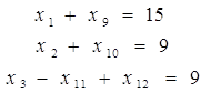 х1 £ 15; х2 £ 9; х3 ³ 9 хj ³ 0, j=1,2,3 3.Экономическое содержание основных и дополнительных переменных. Основные переменные: х1 - количество скважин I категории х2 - количество скважин II категории х3 - количество скважин III категории Вводим дополнительные переменные: х4 - неиспользованные обсадные трубы х5 - остаток неиспользованных хим/реагентов х6 - остаток неиспользованных глины и глинопорошка х7 - остаток талевого каната х8 - остаток ГСМ х9 - кол-во скважин I-категории, недостающих до max числа 15; х10 -кол-во скважин II-категории, недостающих до max числа 9; х11 –кол-во скважин III-категории, превышающих min число 9; х12 - количество недостроенных скважин по категориям. 4. Канонический вид.
