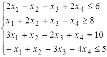 Вместо того, чтобы исследовать функцию f на min, будем исследовать на f1= - f на max. В ограничениях содержащих £ к левой части прибавим дополнительную не отрицательную переменную. В ограничениях содержащих ³ - в левой части вычтем не отрицательную дополнительную переменную. Условие не отрицательности в равенство не переводится. f1 = -f =х1 - 2х2 + х3 - х4 ® max