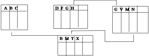 для заданного множества F- зависимостей обозначается (X1, X2, ..., Xk) -> Yгде X1, X2, ..., Xk , множество эквивалентных левых частей F- зависимостей, а Y объединение правых частей F- зависимостей. Синтез реляционных баз данныхБаза данных состоит из множества атрибутов и ключей. С точки зрения теоретико-множественного описания реляционной базой данных d называется такая совокупность отношений {R1, R2, ...,Rp}, в которой каждое отношение имеет вид Ri= (Si,Ki), где Si- множество атрибутов, а Ki - множество атрибутов образующих ключ. Предположим на входе задано множество F- зависимостей F над R. С их помощью требуется создать базу данных R=( R1, R2, ...,Rp). Эта БД должна удовлетворять следующим требованиям: 1. множество F полностью характеризуется с помощью R , т.е. где К – выделенный ключ Ri} 2. Каждое отношение Ri находится в третьей нормальной форме. 3. Не существует базы данных с меньшим числом отношений, удовлетворяющим пунктам 1 и 2. 4. Соединение всех полученных отношений Ri дает исходное отношение R. Алгоритм порождающий базу данных из заданных F-зависимостей называется алгоритмом синтеза. Определение. Если R – база данных и на ней задано множество F-зависимостей G, то в ней существует по крайней мере |EG| отношений. Это означает, что в R столько же отношений, сколько и классов эквивалентности. Из этого следует следующее. Пусть F - множество F – зависимостей. Любая база данных должна иметь |EF’| отношений, где F’ неизбыточное покрытие для F. Исходя из этого строится способ построения структуры базы данных. Сначала находится неизбыточное покрытиеF’ для F и в EF’ вычисляем классы эквивалентности. Для каждого EF’(X) строим отношение, состоящее из всех атрибутов, появляющихся в EF’(X). При этом атрибуты левой части каждого класса эквивалентности образуют выделенный ключ. Реализация этого способа позволяет получить алгоритм SYNTHESIZE Вход: множество F – зависимостей F над R. Выход: полная схема баз данных для F. 1. Наити для F редуцированное минимальное покрытие G. 2. 3. Вернуться к п. 2. Пример.