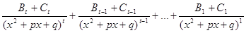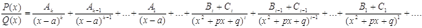 Дробь P(x)/Q(x) можно разложить в сумму простейших дробей, где Ai, Bi, Ci – постоянные, а именно: каждому множителю (x-a)k