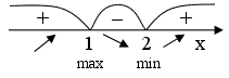 то tg( В першому випадку функція f(x) є зростаючою на проміжку а; b, в другому - спадною. Потрібно спитати учнів, а яким же чином веде себе функція, коли f(x) при переході через деяку точку х0 змінює свій знак. Це буває лише тоді, коли в точці х0 функція приймає своє найбільше або найменше значення. Якщо похідна змінює свій знак з “+” на “-” (спочатку функція зростала, а при переході через точку х0 почала спадати), то х0- є точкою максимуму, значення функції в цій точці є максимумом функції. Інакше, якщо при переході через точку х0 похідна змінила свій знак з “-” на “+”, то х0 - є точкою мінімума, а значення функції в цій точці – мінімумом функції. Ці точки називають екстремальними точками функції. Внутрішні точки області визначення функції, в яких її похідна дорівнює нулю або не існує називають критичними точками цієї функції. Формулюється необхідна умова екстремуму.