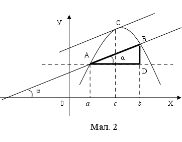 Після побудови графіків функцій потрібно акцентувати увагу учнів на те, що вітки графіка парної функції симетричні відносно осі ординат, а вітки графіка непарної функції симетричні відносно початку координат. Це варто довести до учнів як властивості парної та непарної функції, що допоможе їм при побудові графіків. При поясненні нового, дещо складнішого матеріалу варто користуватись наочністю, це найкраще відображає саму суть теми, всі процеси, пов’язані з утворенням певних понять. Розглянемо використання наочності та ілюстрацій при вивченні теми “Похідна та її застосування” при дослідженні функцій на екстремуми. Учні вже вивчили і знають геометричний зміст похідної, ознаки зростання і спадання функції, тому просто варто пригадати це на початку урока. Геометричний зміст похідної: Похідна функції f(x) в точці х0 дорівнює тангенсу кута нахилу дотичної до кривої з додатним напрямом осі ОХ у точці з абсцисою х0.