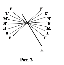 1) Если прямые CN и CL не встречают прямой АВ, то любая прямая СМ, проходящая через т. C внутри вертикальных углов NCL и N’CL’ также не встретит прямой АВ (рис.3, рис.4). Отсюда первое следствие аксиомы Лобачевского: через т. С вне прямой АВ плоскости АВС, проходит бесчисленное множество прямых, не пересекающихся с прямой АВ. 2) Если соединить (рис.2) какую-либо точку прямой DB с т. С, получим прямую, допустим, СК, проходящую через т. С и встречающую АВ. Итак, все прямые, проходящие через т. С внутри прямого угла NCD, разбиваются на две категории, на два класса: встречающие прямую АВ (названные Лобачевским «сходящимися» с АВ) и не встречающие прямую АВ (их Лобачевский называет «расходящимися» с АВ). Любая прямая первой категории образует с перпендикуляром CD угол, меньший угла, образованного перпендикуляром CD с любой прямой второй категории. Вращаясь непрерывно около т. С в направлении против часовой стрелки, прямая СК на известном этапе, допустим в положении CL, перестанет пересекать АВ и из сходящейся перейдет в категорию расходящихся с АВ прямых. Эта предельная прямая CL, служащая переходной прямой, граничной, отделяющей сходящиеся от расходящихся прямых, и названной Лобачевским параллельной к прямой АВ из т. С. Итак, параллельная CL – это не просто расходящаяся прямая, а первая, граничная расходящаяся, т.е. такая, что любая прямая, проходящая через т. С внутри угла, образованного параллельной CL и перпендикуляром CD, является сходящейся прямой, а всякая прямая, проходящая внутри угла LCN будет расходящаяся с прямой АВ. Угол DCL, образованный параллельной CL с перпендикуляром CD, называют углом параллельности. В силу симметрии относительно перпендикуляра CD внутри прямого угла N’CD получим картину, аналогично той, которую мы имеем в угле NCD, т.е. построив угол DCF равный углу DCL, получим прямую CF, также параллельную прямой АВ слева от перпендикуляра CD. Итак, через т. С, лежащую вне прямой АВ, проходят в плоскости АВС две прямые, параллельные прямой АВ, в одну и другую сторону этой прямой. Все прямые, проходящие внутри вертикальных углов, образованных параллельными прямыми LL’ и GG’ (в том числе и евклидова «параллельная» NN’), расходятся с АВ; все остальные прямые, проходящие через т. С сходятся с прямой АВ. Следовательно: а) 2 прямые как АВ и NN’, имеющие общий перпендикуляр CD, расходятся; б) если вращать прямую NN’ около т. С, допустим, по часовой стрелке, а прямую АВ около т.D в том же направлении так, чтобы углы, образованные этими прямыми с пересекающей их прямой CD, оставались равными, то прямые АВ и NN’ остаются расходящимися, т.е. две прямые, образующие при пересечении с третьей прямой равные соответственные углы, расходятся.