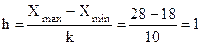 Требуется: 1. вычислить точечные оценки для математического ожидания, среднеквадратического отклонения, коэффициентов асимметрии и эксцесса; 2. составить интервальный статистический ряд распределения относительных частот и построить гистограмму и полигон относительных частот; 3. найти эмпирическую функцию распределения и построить ее график и график кумуляты; 4. исходя из общих представлений о механизме образования СВ Х, а также по виду гистограммы и полигона относительных частот и вычисленным числовым характеристикам, выдвинуть гипотезу о виде распределения СВ Х; записать плотность распределения вероятностей и функцию распределения для выдвинутого гипотетического закона, заменяя параметры закона вычисленными для них оценками; 5. по критерию согласия χ2 Пирсона проверить соответствие выборочного распределения гипотетическому закону для уровня значимости q = 0,05; 6. вычислить интервальные оценки для математического ожидания и среднеквадратического отклонения, соответствующие доверительным вероятностям γ = 0,95 и γ = 0,99. Решение: Изучение непрерывных случайных величин начинается с группировки статистического материала, т. е. разбиения интервала наблюдаемых значений СВ Х на k частичных интервалов равной длины и подсчета частот попадания наблюдаемых значений СВ Х в частичные интервалы. Количество выбираем равным 10 (k = 10). Разобьем весь диапазон значений на 10 интервалов (разрядов). Длину частичного интервала определим по формуле: