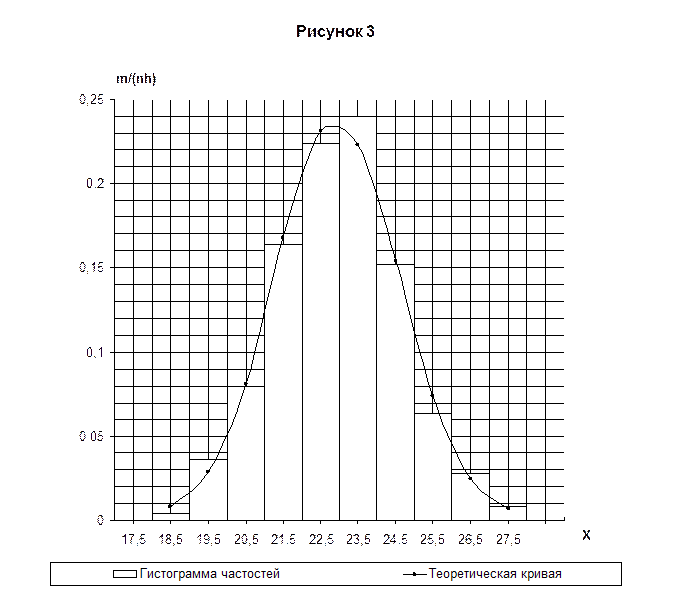 результате вычислений получили Построим нормальную кривую. Для этого из середин частичных интервалов восстании перпендикуляры высотой pi/h (pi — вероятность попадания СВ Х в частичный интервал; h — длина интервала). На рисунке 3 концы этих перпендикуляров отмечены кружками. Полученные точки соединены плавной кривой. Сравнение гистограммы и нормальной кривой наглядно показывает, что нормальная кривая хорошо сглаживает гистограмму относительных частот.
