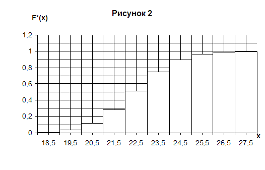0,004, если 18 < x ≤ 19; 0,04, если 19 < x ≤ 20; 0,12, если 20 < x ≤ 21; 0,284, если 21 < x ≤ 22; F*(x) = 0,508, если 22 < x ≤ 23; 0,748, если 23 < x ≤ 24; 0,9, если 24 < x ≤ 25; 0,964, если 25 < x ≤ 26; 0,992, если 26 < x ≤ 27; 1, если 27 < x ≤ 28; 1, если x ≥ 28; График эмпирической функции изображен на рисунке 2.
