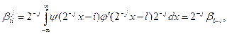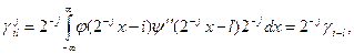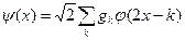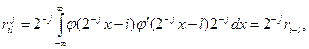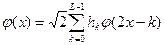 Из свойства 4’ непосредственно следует, что, во-первых, функция j может быть представлена в виде линейной комбинации базисных функций пространства V-1 . Так как функции {jj,k(x)=2-j/2j(2-jx-k)}kÎZ образуют ортонормальный базис в Vj, то имеем Вообще говоря, сумма в выражении (1.8) не обязана быть конечной. Можно переписать (1.8) в виде
