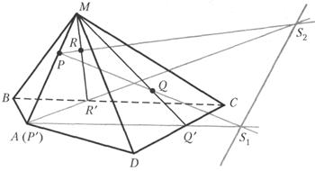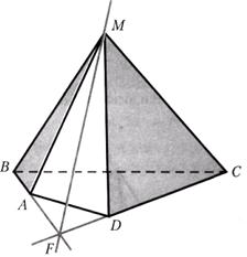 Точка F принадлежит прямой АВ, две точки которой лежат в плоскости МАВ. Тогда по аксиоме (Если две точки прямой принадлежат плоскости, то все точки прямой, определяемой ими, лежат в этой плоскости) и точка F лежат в плоскости МАВ. Аналогично заключаем, что точка F лежит и в плоскости MCD. Таким образом, точка F — это вторая общая точка плоскостей МАВ и MCD. Итак, прямая MF — это искомая линия пересечения плоскостей МАВ и MCD. Задача №2 На ребре МА пирамиды MABCD