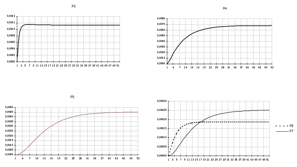 Приложение 2Текст программы численного решения системы семи дифференциальных уравнений Sub DU() x1=1 'начальные условия при t=0 x2=0 'начальные условия при t=0 x3=0 'начальные условия при t=0 x4=0 'начальные условия при t=0 x5=0 ' начальные условия при t=0 x6=0 ' начальные условия при t=0 x7=0 ' начальные условия при t=0 Sheets("1").Cells(k+2;2).Value=x1 Sheets("1").Cells(k+2;3).Value=x2 Sheets("1").Cells(k+2;4).Value=x3 Sheets("1").Cells(k+2;5).Value=x4 Sheets("1").Cells(k+2;6).Value=x5 Sheets("1").Cells(k+2;7).Value=x6 Sheets("1").Cells(k+2;8).Value=x7 dt=30/50 a12=Sheets("1").Cells(5;9).Value ' инт. потока a13=Sheets("1").Cells(5;10).Value ' инт. потока a21=Sheets("1").Cells(5;11).Value ' инт. потока a23=Sheets("1").Cells(5;12).Value ' инт. потока a34=Sheets("1").Cells(5;13).Value ' инт. потока a45=Sheets("1").Cells(5;14).Value ' инт. потока a52=Sheets("1").Cells(5;15).Value ' инт. потока a26=Sheets("1").Cells(5;16).Value ' инт. потока a62=Sheets("1").Cells(5;17).Value ' инт. потока a67=Sheets("1").Cells(5;18).Value ' инт. потока a72=Sheets("1").Cells(5;19).Value ' инт. потока For k = 0 To 50 k1=One(x1;x2;x3;x4;x5;x6;x7;a12;a13;a21)*dt m1=Two(x1;x2;x3;x4;x5;x6;x7;a12;a26;a21;a23;a52;a62;a72)*dt n1=Three(x1;x2;x3;x4;x5;x6;x7;a13;a23;a34)*dt o1=Four(x1;x2;x3;x4;x5;x6;x7;a34;a45)*dt p1=Five(x1;x2;x3;x4;x5;x6;x7;a45;a52)*dt r1=Six(x1;x2;x3;x4;x5;x6;x7;a26;a67;a62)*dt s1=Seven(x1;x2;x3;x4;x5;x6;x7;a67;a72)*dt k2=One(x1+0,5*k1;x2+0,5*m1;x3+0,5*n1;x4+0,5*o1;x5+0,5*p1; x6+0,5*r1;x7+0,5*s1;a12;a13;a21)*dt m2=Two(x1+0,5*k1;x2+0,5*m1;x3+0,5*n1;x4+0,5*o1;x5+0,5*p1; x6+0,5*r1;x7+0,5*s1;a12;a26;a21;a23;a52;a62;a72)*dt n2=Three(x1+0,5*k1;x2+0,5*m1;x3+0,5*n1;x4+0,5*o1;x5+0,5*p1;x6+0,5*r1;x7+0,5*s1;a13;a23;a34)*dt o1=Four(x1+0,5*k1;x2+0,5*m1;x3+0,5*n1;x4+0,5*o1;x5+0,5*p1;x6+0,5*r1;x7+0,5*s1;a34;a45)*dt p1=Five(x1+0,5*k1;x2+0,5*m1;x3+0,5*n1;x4+0,5*o1;x5+0,5*p1;x6+0,5*r1;x7+0,5*s1;a45;a52)*dt r1=Six(x1+0,5*k1;x2+0,5*m1;x3+0,5*n1;x4+0,5*o1;x5+0,5*p1;x6+0,5*r1;x7+0,5*s1;a26;a67;a62)*dt s1=Seven(x1+0,5*k1;x2+0,5*m1;x3+0,5*n1;x4+0,5*o1;x5+0,5*p1;x6+0,5*r1;x7+0,5*s1;a67;a72)*dt k3=One(x1+0,5*k2;x2+0,5*m2;x3+0,5*n2;x4+0,5*o2;x5+0,5*p2;x6+0,5*r2;x7+0,5*s2;a12;a13;a21)*dt m3=Two(x1+0,5*k2;x2+0,5*m2;x3+0,5*n2;x4+0,5*o2;x5+0,5*p2;x6+0,5*r2;x7+0,5*s2;a12;a26;a21;a23;a52;a62;a72)*dt n3=Three(x1+0,5*k2;x2+0,5*m2;x3+0,5*n2;x4+0,5*o2;x5+0,5*p2;x6+0,5*r2;x7+0,5*s2;a13;a23;a34)*dt o3=Four(x1+0,5*k2;x2+0,5*m2;x3+0,5*n2;x4+0,5*o2;x5+0,5*p2;x6+0,5*r2;x7+0,5*s2;a34;a45)*dt p3=Five(x1+0,5*k2;x2+0,5*m2;x3+0,5*n2;x4+0,5*o2;x5+0,5*p2;x6+0,5*r2;x7+0,5*s2;a45;a52)*dt r3=Six(x1+0,5*k2;x2+0,5*m2;x3+0,5*n2;x4+0,5*o2;x5+0,5*p2; x6+0,5*r2;x7+0,5*s2;a26;a67;a62)*dt s3=Seven(x1+0,5*k2;x2+0,5*m2;x3+0,5*n2;x4+0,5*o2;x5+0,5*p2;x6+0,5*r2;x7+0,5*s2;a67;a72)*dt k4=One(x1+k3;x2+m3;x3+n3;x4+o3;x5+p3;x6+r3;x7+s3;a12;a13;a21)*dt m4=Two(x1+k3;x2+m3;x3+n3;x4+o3;x5+p3;x6+r3;x7+s3;a12;a26;a21;a23;a52;a62;a72)*dt n4=Three(x1+k3;x2+m3;x3+n3;x4+o3;x5+p3;x6+r3;x7+s3;a13;a23;a34)*dt o4=Four(x1+k3;x2+m3;x3+n3;x4+o3;x5+p3;x6+r3;x7+s3;a34;a45)*dt p4=Five(x1+k3;x2+m3;x3+n3;x4+o3;x5+p3;x6+r3;x7+s3;a45;a52)*dt r4=Six(x1+k3;x2+m3;x3+n3;x4+o3;x5+p3;x6+r3;x7+s3;a26;a67;a62)*dt s4=Seven(x1+k3;x2+m3;x3+n3;x4+o3;x5+p3;x6+r3;x7+s3;a67;a72)*dt x1=x1+(k1+2*k2+2*k3+k4)/6 x2=x2+(m1+2*m2+2*m3+m4)/6 x3=x3+(n1+2*n2+2*n3+n4)/6 x4=x4+(o1+2*o2+2*o3+o4)/6 x5=x5+(p1+2*p2+2*p3+p4)/6 x6=x6+(r1+2*r2+2*r3+r4)/6 x7=x7+(s1+2*s2+2*s3+s4)/6 Sheets("1").Cells(k+3;2).Value=x1 Sheets("1").Cells(k+3;3).Value=x2 Sheets("1").Cells(k+3;4).Value=x3 Sheets("1").Cells(k+3;5).Value=x4 Sheets("1").Cells(k+3;6).Value=x5 Sheets("1").Cells(k+3;7).Value=x6 Sheets("1").Cells(k+3;8).Value=x7 Next End Sub Function One(x1;x2;x3;x4;x5;x6;x7;a12;a13;a21)'Вер.P1 One=-(a12+a13)*x1+a21*x2 End Function FunctionTwo(x1;x2;x3;x4;x5;x6;x7;a12;a26;a21;a23;a52;a62;a72)'Вер.P4 Two=a12*x1-(a26+a21+a23)*x2+a52*x5+a62*x6+a72*x7 End Function Function Three(x1;x2;x3;x4;x5;x6;x7;a13;a23;a34)'Вер.P3 Three=a13*x1+a23*x2-a34*x3 End Function Function Four(x1;x2;x3;x4;x5;x6;x7;a34;a45)'Вер.Р4 Four=a34*x3-a45*x4 End Function Function Five(x1;x2;x3;x4;x5;x6;x7;a45;a52)'Вер.Р5 Five=a45*x4-a52*x5 End Function Function Six(x1;x2;x3;x4;x5;x6;x7;a26;a67;a62)'Вер.Р6 Six=a26*x2-(a67+a62)*x6 End Function Function Seven(x1;x2;x3;x4;x5;x6;x7;a67;a72)'Вер.Р7 Seven=a67*x6-a72*x7 End Function Приложение 3Оформление рабочего листа MS EXCEL в задаче 3