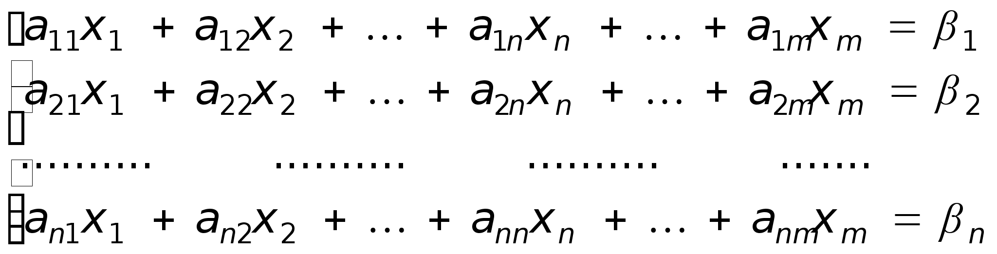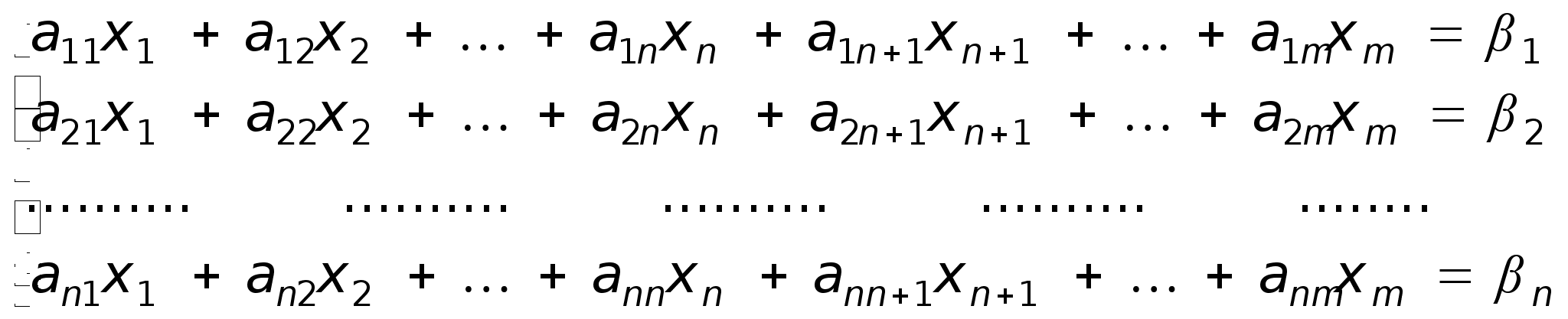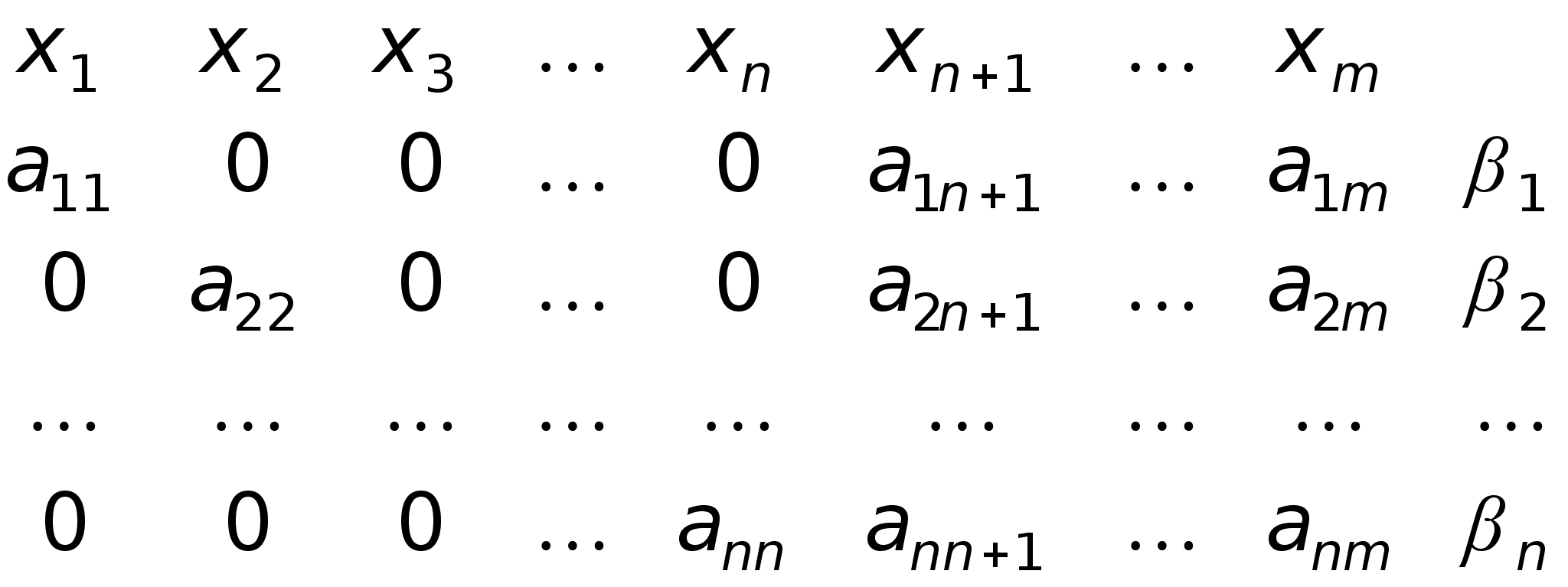 Можно считать, что система (3.34) решена относительно базисных переменных x1, x2, …, xn. Переносить члены, соответствующие свободным переменным, в правую часть для фактического решения системы (3.34) относительно базисных переменных не будем, так как в дальнейшем нас будет интересовать решение, где все свободные переменные равны 0. Полагая xn+1=xn+2=…=xm=0, получим: