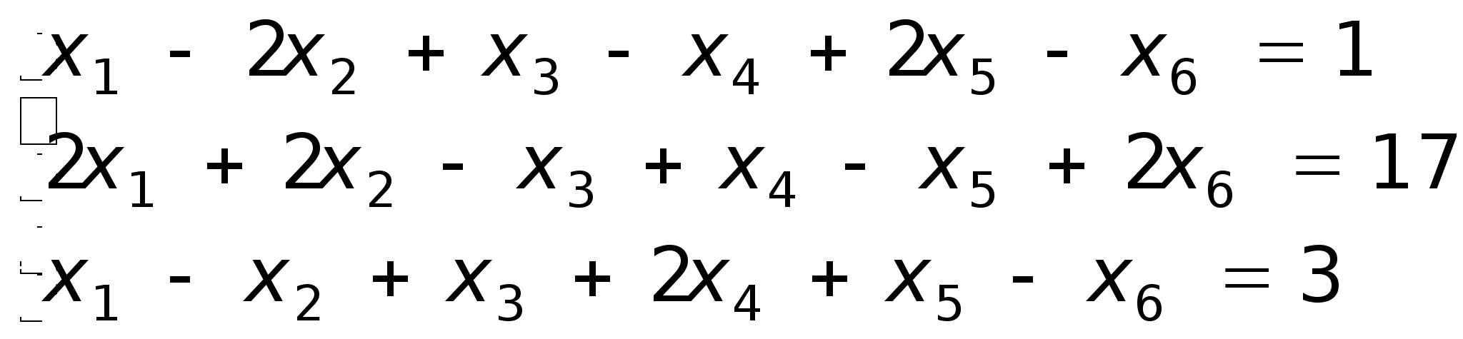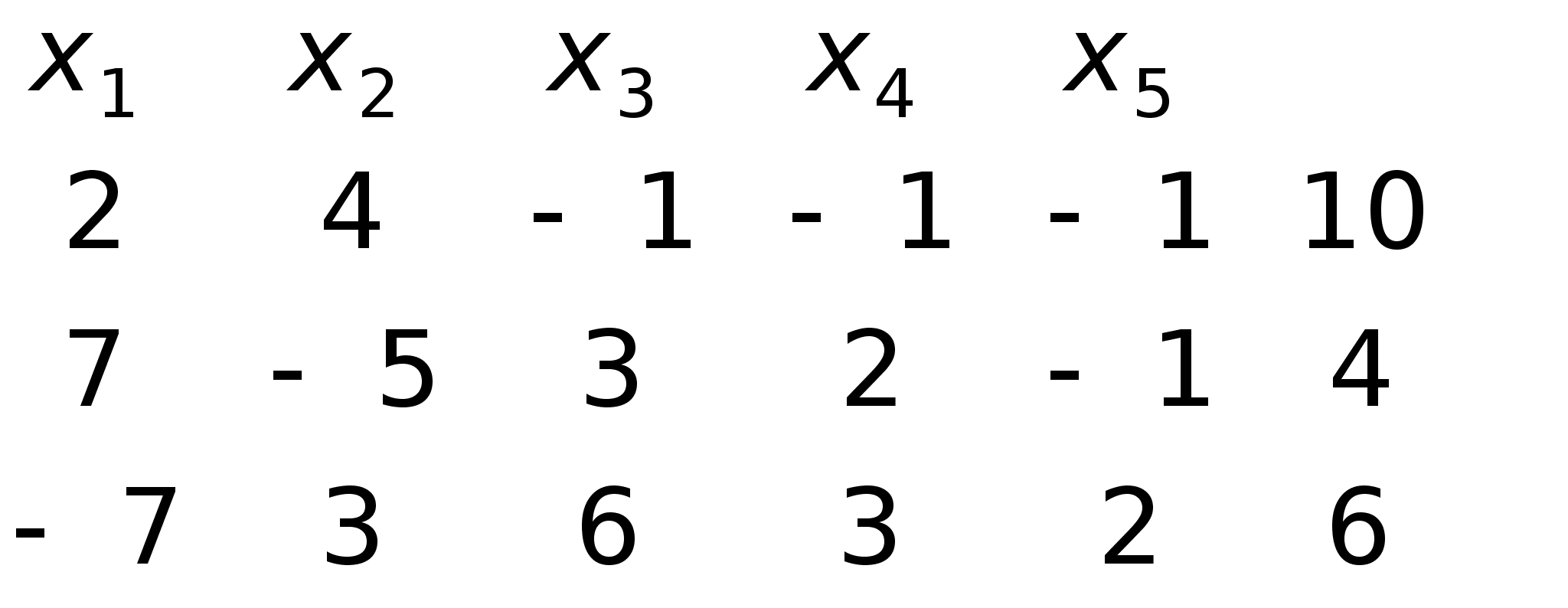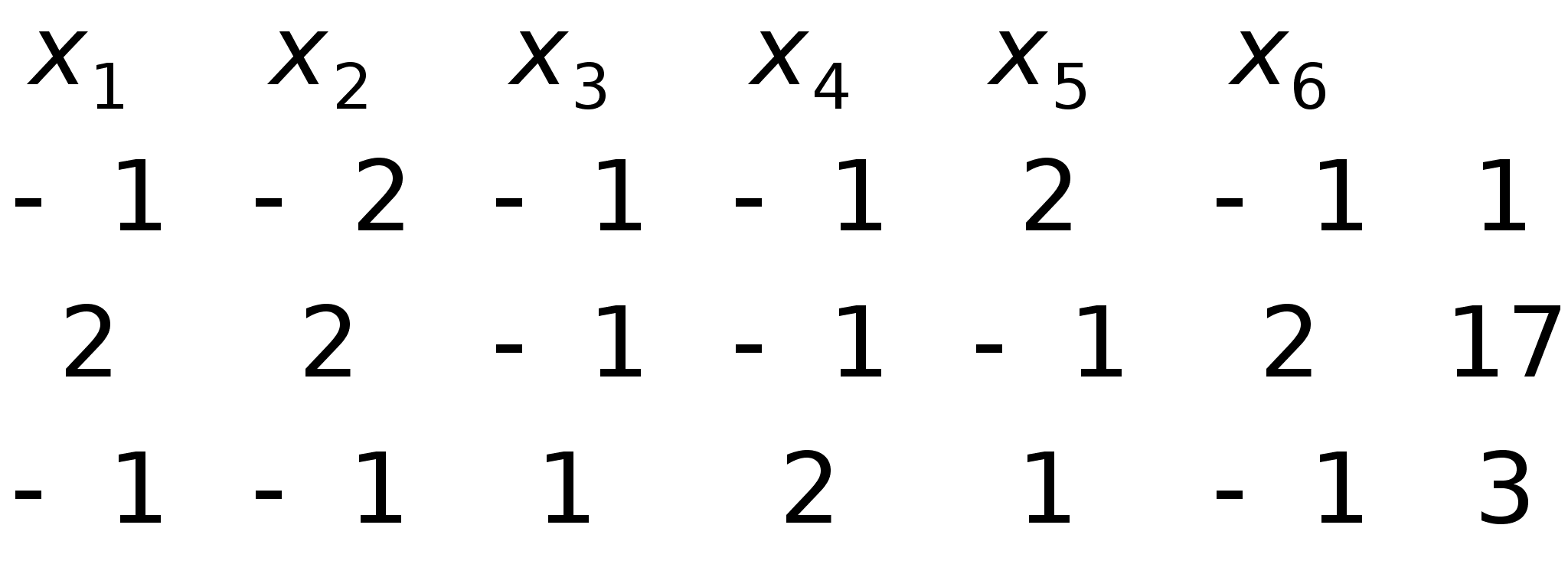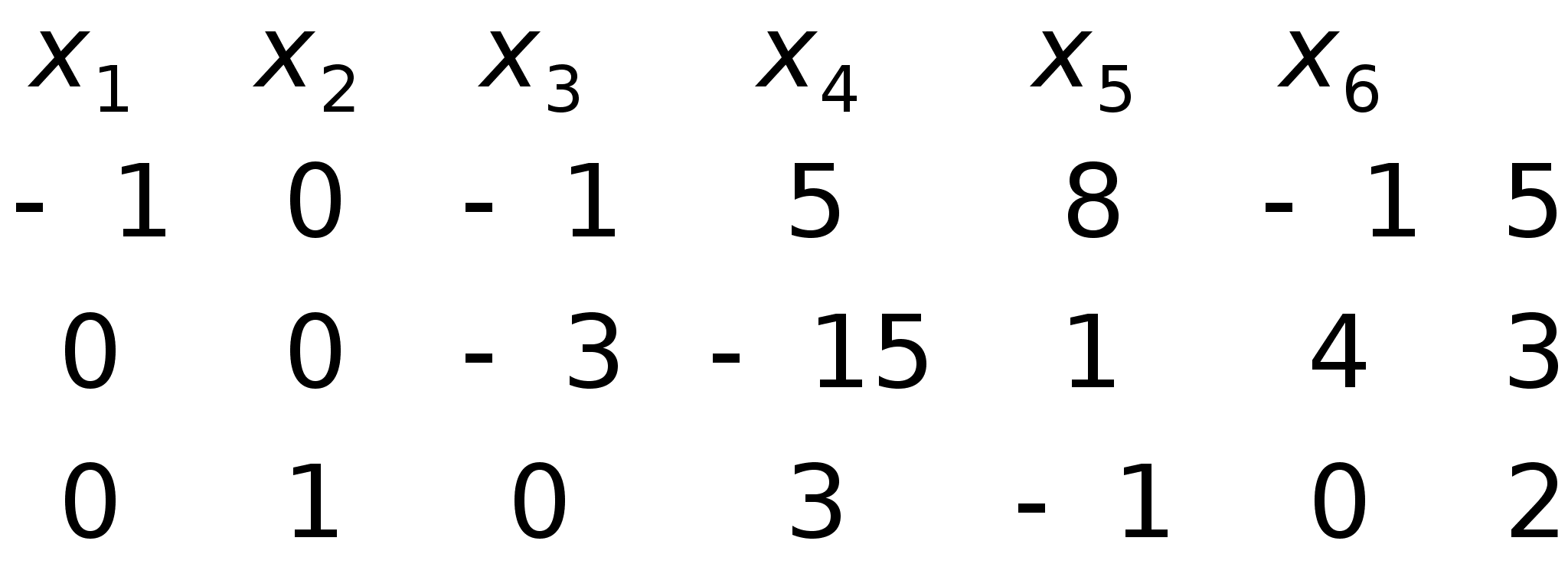 Нужно данную систему разрешить относительно переменных x1, x2, x3. Следовательно свободными переменными будут x4, x5, x6. Напишем таблицу, соответствующую данной системе уравнений.