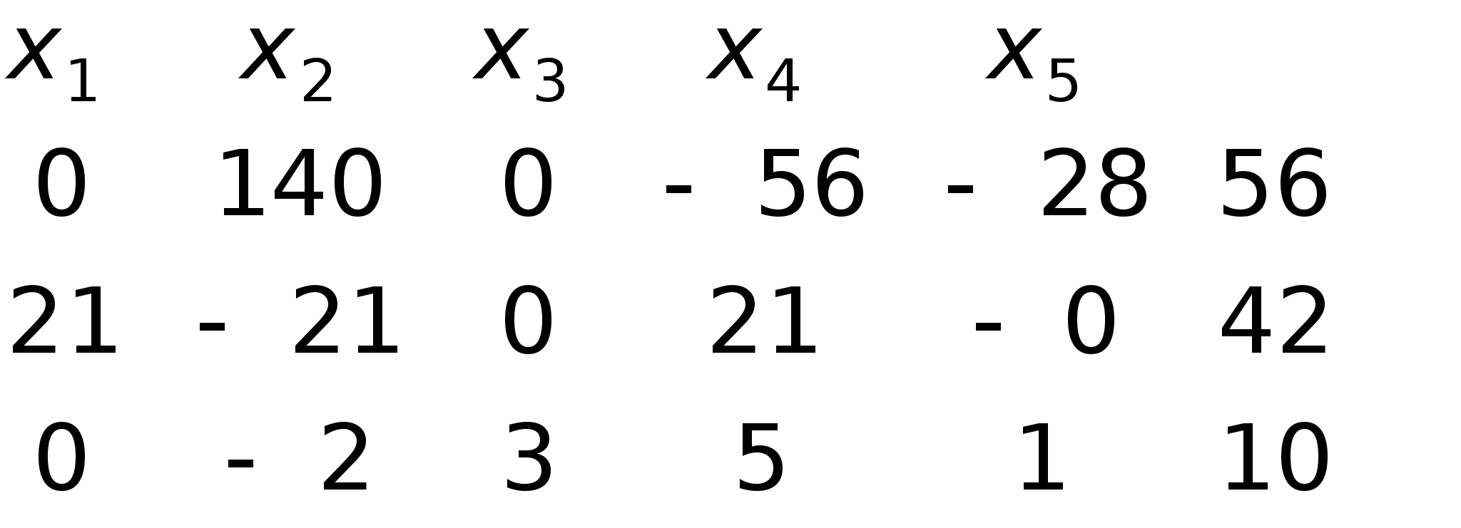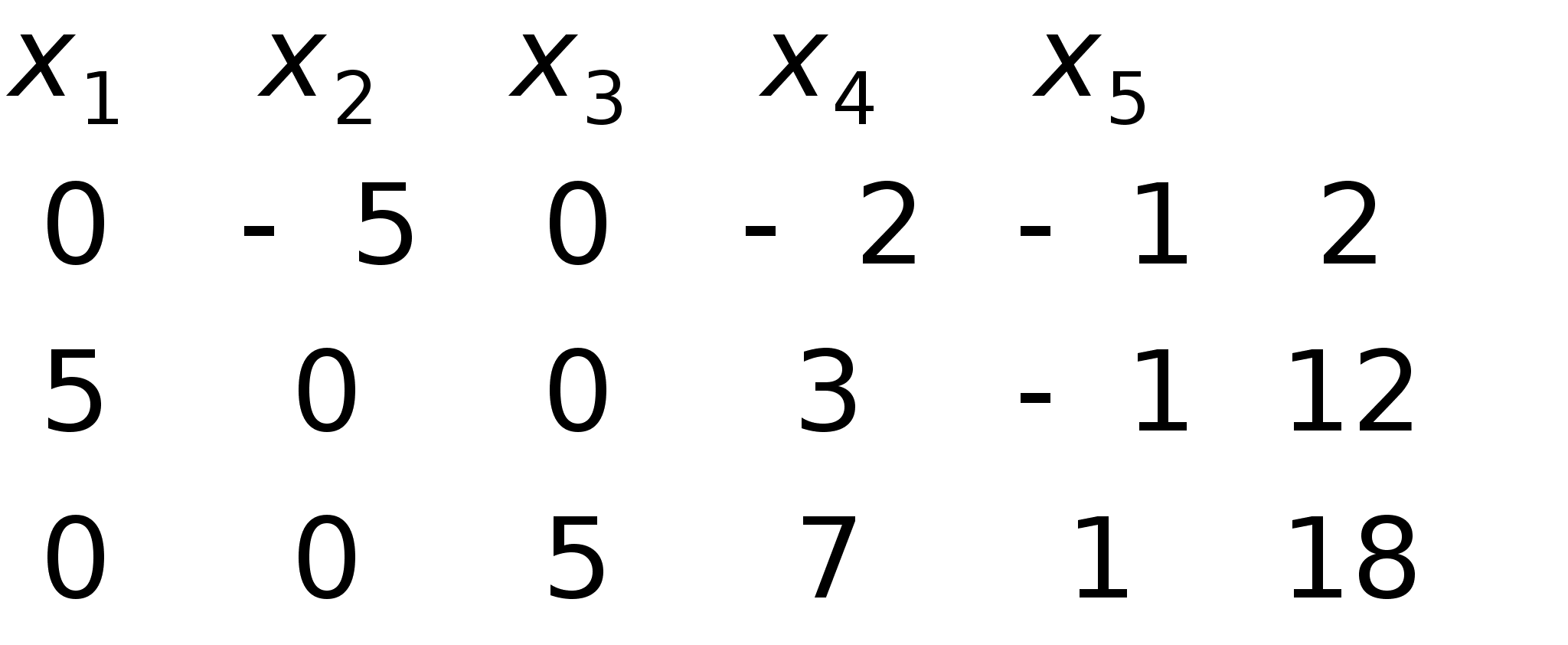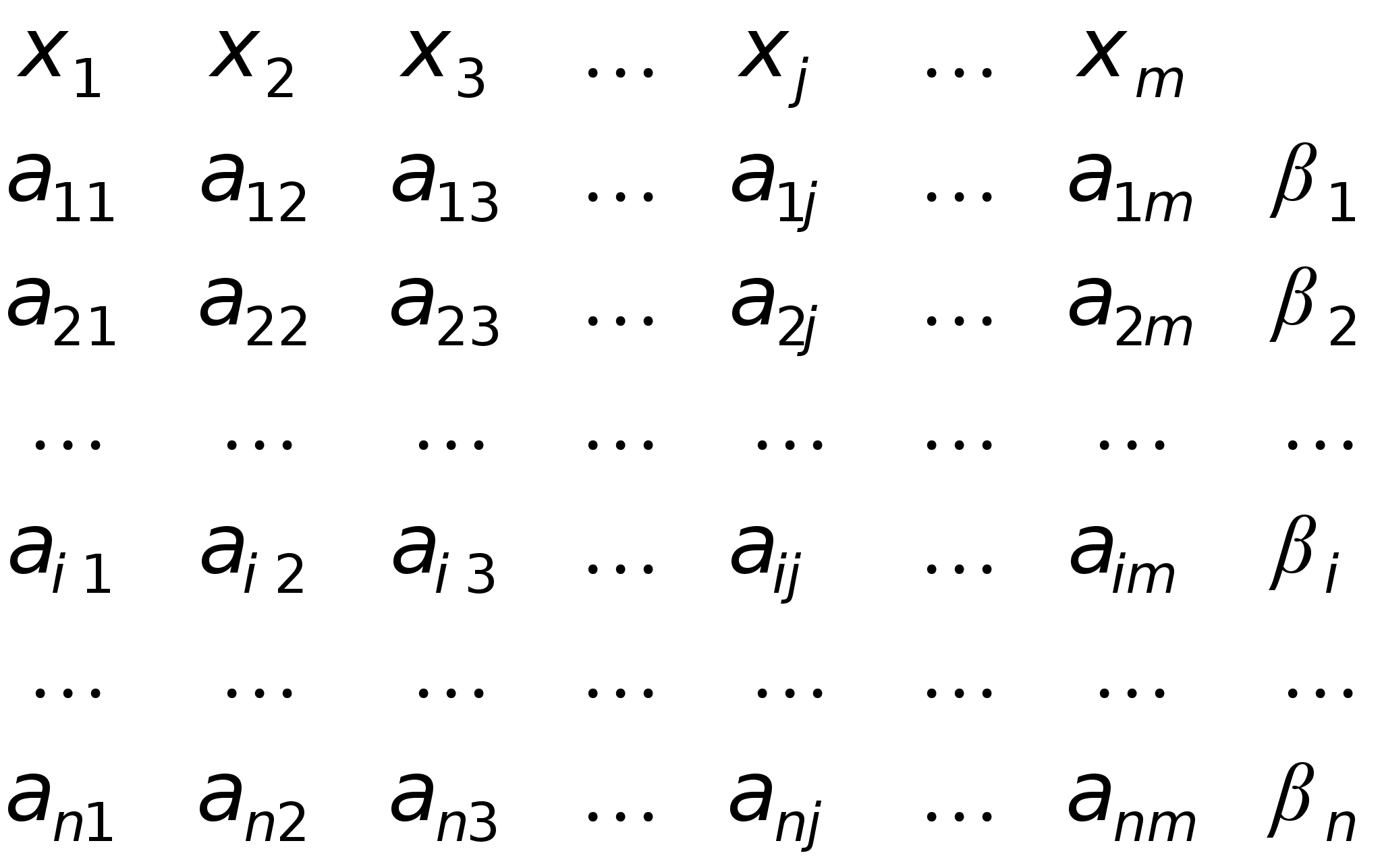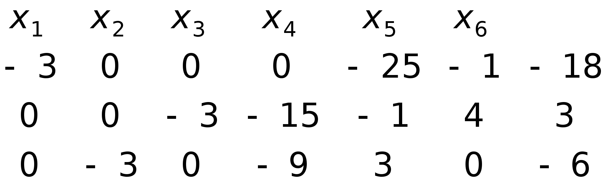 Нужно данную систему разрешить относительно переменных x1, x2, x3. Следовательно свободными переменными будут x4, x5, x6. Напишем таблицу, соответствующую данной системе уравнений.