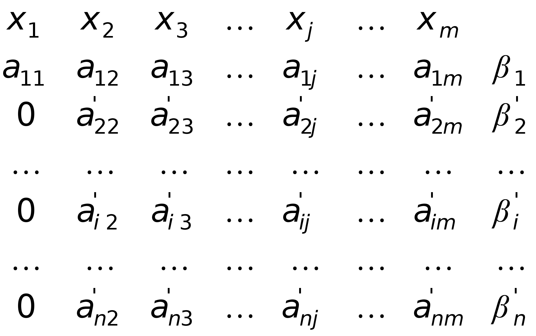 Система (3.32) эквивалентна первоначальной системе (3.22), но в системе (3.32) переменная x1 исключена из всех уравнений, кроме первого. Если в таблице (3.31) элемент a’220, то, приняв его за разрешающий элемент и проделав над таблицей (3.31) S-преобразование, получим новую таблицу. И в системе уравнений, соответствующей этой таблице, переменная x2 будет исключена из всех уравнений, кроме второго. Если в таблице (3.31) a’22=0, то во втором столбце найдем элемент, не равный нулю, и примем его за разрешающий. Пусть это будет a’12. Тогда выполняя симплекс преобразование над таблицей (3.31), мы исключим x2 из всех уравнений, кроме i-того. Продолжая так дальше, мы после n преобразований придем к таблице, имеющей, например, следующий вид.