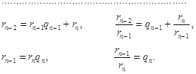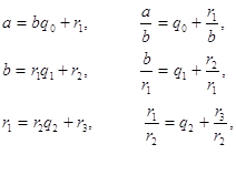 Докажем, что каждое из чисел rk линейно выражается через a и b с целыми коэффициентами. Для r1 утверждение тривиально: r1 = a - bq1 . Считая, что каждое из чисел r1 , r2 , . . . , rn-1 является целочисленной линейной комбинацией чисел a и b (rk = ak a + bk b), имеем rn = an-2 a + bn-2 b - (an-1 a + bn-1 b) qn-1 = (an-2 - an-1) a + (bn-2 - bn-1 qn-1)b. ð Пример. Найти линейное представление НОД(160, 72). Решение. Из второго равенства системы (2) следует, что 8 = 72 - 16×4, а из первого равенства получим, что 16 = 160 - 72×2. Из двух полученных равенств находим: 8 = 72 - 16 × 4 = 72 - (160 - 72 × 2) × 4 = (-4) × 160 + 9 × 72. Таким образом, искомое представление НОД имеет вид: 8 = (-4) × 160 + 9 × 72. 30. Связь алгоритма Евклида с непрерывными