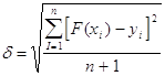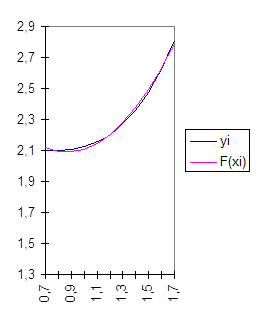 Здесь yi - значения решения дифференциального уравнения, полученные в п.1.2. (см. Таблицу 1), F(xi) - значения аппроксимирующей функции при тех же значениях xi, полученные в п. 4. Их разность показывает величину отклонения аппроксимирующей функции от аппроксимируемой в узлах xi. Рассчитаем погрешность аппроксимации: