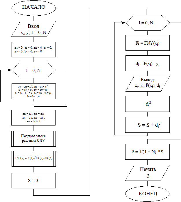 График аппроксимирующей функции представлен на рисунке 5. 6. ПОСТРОЕНИЕ БЛОК-СХЕМЫ И РАЗРАБОТКА ПРОГРАММЫ АППРОКСИМАЦИИ Блок-схема алгоритма решения задачи аппроксимации методом наименьших квадратов представлена на Рис. 6. Первым шагом осуществляется ввод значений X(I),Y(I),N. Далее обнуляются значения всех коэффициентов. В цикле рассчитываются коэффициенты 3-х линейных уравнений. (см. п. 2.2). После цикла приравниваем одинаковые коэффициенты в матрице. Потом выполняется подпрограмма решения линейных уравнений. Следующим шагом происходит описание функции пользователя: FNY(X) = K(1) X 2 + K(2) X + K(3) Следующий цикл находит значения аппроксимирующей функции, разность между этими значениями и корнями дифференциального уравнения Y(I), квадрат разности, а также производит их суммирование. Далее находится величина погрешности аппроксимации и все данные выводятся на экран. Общая программа решения дифференциального уравнения с последующей аппроксимацией результатов представлена на рис. 7 вместе с программой решения дифференциального уравнения, так как из нее получают значения X(I) и Y(I).
