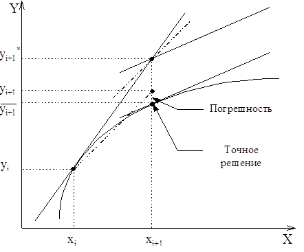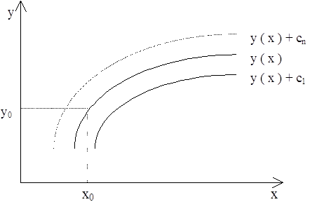 Рис 1. Множество решений дифференциального уравнения. Метод Эйлера - Коши - наиболее точный метод решения дифференциального уравнения (второй порядок точности). Этот метод предполагает следующий порядок вычислений: yi+1* = yi + h f( xi ; yi ), где i = 0,1,2 ... n yi+1 = yi + h (f( xi ; yi ) + f( xi+1 ; yi+1*)) / 2 Число значений n можно найти, разделив интервал на шаг: n = (xn - xo) / h Геометрически это означает, что определяется направление касательной к интегральной кривой в исходной точке хi,yi и во вспомогательной точке хi+1,yi+1*, а в качестве окончательного направления берется среднее этих направлений (показано пунктирной линией на рис. 2)