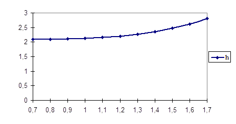 Рис.2. Графическая интерпретация метода Эйлера - Коши. Решение yi+1, найденное методом Эйлера - Коши, намного ближе к точному решению, чем решение yi+1*, найденное методом Эйлера. Погрешность метода пропорциональна шагу h во второй степени, т.е. метод Эйлера - Коши имеет второй порядок точности. 1.2. РУЧНОЙ РАСЧЁТ РЕШАЕМОЙ ЗАДАЧИ По условию задачи нужно решить дифференциальное уравнение y = x + cos ( y / Ö0.3 ) с начальными условиями x0 = 0.7, y0 = 2.1 на интервале [ 0.7 ; 1.7 ] с шагом h = 0.1 . По формуле метода Эйлера -Коши yi+1* = yi + h f( xi ; yi ), yi+1 = yi + h (f( xi ; yi ) + f( xi+1 ; yi+1*)) / 2 Найдем y1* и y1 f( x0 ; y0 ) = 0.7 + cos (2.1 / Ö0.3 ) = - 0.069675 x1 = x0 + h = 0.7 + 0.1=0.8 y1* = y0 + h * f( x0 ; y0 ) = 2.1 + 0.1 * (- 0.069675) = 2.093032 y1 = y0 + h * (f( x0 ; y0 ) + f( x0 + h ; y1* )) / 2 = 2.1 + 0.1 * ((- 0.069675) + 0.022266)/2 = = 2.09763 Аналогично найдём остальные значения x и y : f( x1 ; y1 ) = 0.8 + cos (2.09763/ Ö0.3 ) = 0.02757 x2 = 0.8 + 0.1 = 0.9 y2* = 2.09763 + 0.1 * 0.02757 = 2.100387 y2 = 2.09763 + 0.1 * (0.02757 + 0.130776) / 2 = 2.105547 f( x2 ; y2 ) = 0.9 + cos (2.105547 / Ö0.3 ) = 0.136831 x3 = 0.9 + 0.1 = 1 y3* = 2.105547 + 0.1 * 0.136831 = 2.11923 y3 = 2.105547 + 0.1 * (0.136831 + 0.25321) / 2 = 2.125049 f( x3 ; y3 ) = 1 + cos (2.125049 / Ö0.3 ) = 0.260317 x4 = 1+ 0.1 = 1.1 y4* = 2.125049 + 0.1 * 0.260317 = 2.1510807 y4 = 2.125049 + 0.1 * (0.260317 + 0.393124) / 2 = 2.157721 f( x4 ; y4 ) = 1.1 + cos (2.157721 / Ö0.3 ) = 0.401751 x5 = 1.1 + 0.1 = 1.2 y5* = 2.157721+ 0.1 * 0.401751 = 2.1978961 y5 = 2.157721 + 0.1 * (0.401751 + 0.556089) / 2 = 2.205613 f( x5 ; y5 ) = 1.2 + cos (2.205613 / Ö1.3 ) = 0.566933 x6 = 1.2 + 0.1 = 1.3 y6* = 2.205613 + 0.1 * 0.566933 = 2.2623063 y6 = 2.205613 + 0.1 * (0.566933 + 0.750302) / 2 = 2.271475 f( x6 ; y6 ) = 1.3 + cos (2.271475 / Ö0.3 ) = 0.764362 x7 = 1.3 + 0.1 = 1.4 y7* = 2.271475 + 0.1 * 0.764362 = 2.347911 y7 = 2.271475 + 0.1 * (0.764362 + 0.987033) / 2 = 2.359045 f( x7 ; y7 ) = 1.4 + cos (2.359045/ Ö0.3 ) = 1.005629 x8 = 1.4 + 0.1 = 1.5 y8* = 2.359045 + 0.1 * 1.005629 = 2.4596079 y8 = 2.359045 + 0.1 * (1.005629 + 1.280033) / 2 = 2.473328 f( x8 ; y8 ) = 1.5 + cos (2.473328 / Ö0.3 ) = 1.304536 x9 = 1.5+ 0.1 = 1.6 y9* = 2.473328 + 0.1 * 1.304536 = 2.6037816 y9 = 2.473328 + 0.1 * (1.304536 + 1.6414317) / 2 = 2.620626 f( x9 ; y9 ) = 1.6 + cos (2.620626 / Ö0.3 ) = 1.6721351 x10 = 1.6 + 0.1 = 1.7 y10* = 2.620626 + 0.1 * 1.6721351 = 2.7878395 y10 = 2.620626 + 0.1 * (1.6721351 + 2.068584) / 2 = 2.807662 Для оценки погрешности вычислений найдём решение дифференциального уравнения с шагом h / 2 до третьей точки: f( x0 ; y0 ) = 0.7 + cos (2.1 / Ö0.3 ) = - 0.069675 x1 = 0.7 + 0.05 = 0.75 y1* = 2.1 + 0.05 * (- 0.069675) = 2.096516 y1 = 2.1 + 0.05 * ((- 0.069675) + ( - 0.02372)) / 2 = 2.097665 f( x1 ; y1 ) = 0.75 + cos (2.097665 / Ö0.3 ) = - 0.022389 x2 = 0.75 + 0.05 = 0.8 y2* = 2.097665 + 0.05 * (- 0.022389) = 2.096546 y2 = 2.097665 + 0.05 * ((- 0.022389) + 0.026314) / 2 = 2.097763 f( x2 ; y2) = 0.8 + cos (2.097763 / Ö0.3 ) = 0.027724 x3 = 0.8 + 0.05 = 0.85 y3* = 2.097763 + 0.05 * 0.027724 = 2.0991492 y3 = 2.097763 + 0.05 * (0.027724 + 0.079334) / 2 = 2.10044 f( x3 ; y3) = 0.85 + cos (2.10044 / Ö0.3 ) = 0.080838 x4 = 0.85 + 0.05 = 0.9 y4* = 2.10044 + 0.05 * 0.080838 = 2.1044819 y4 = 2.10044 + 0.05 * (0.080838 + 0.135575) / 2 = 2.10585 f( x4; y4) = 0.9 + cos (2.10585 / Ö0.3 ) = 0.137188 x5 = 0.9 + 0.05 = 0.95 y5* = 2.10585 + 0.05 * 0.137188 = 2.1127094 y5 = 2.10585 + 0.05 * (0.137188 + 0.195345) / 2 = 2.114164 f( x5; y5) = 0.95 + cos (2.114164 / Ö0.3 ) = 0.19709 x6 = 0.95 + 0.05 = 1 y6* = 2.114164 + 0.05 * 0.19709 = 2.1240185 y6 = 2.114164 + 0.05 * (0.19709 + 0.259053) / 2 = 2.125567 Для оценки погрешности вычислений используется правило Рунге: yi+1 = yih + (yih/2 - yih ) / (2p - 1) , где: р - порядок метода, для Эйлера - Коши р = 2 Рассчитаем погрешность вычисления в точке х = 1. Найдем уточненное решение: y(1) = 2.125049 + (2.125567 - 2.125049) / (22 - 1) = 2.1252216 e ih = 2p (yih - yih/2) / (2p - 1) = 22 (2.125567 - 2.125049) / 3 = 6.9 * 10 -4 e ih/2 = (yih - yih/2) / (2p - 1) = (2.125567 - 2.125049) / 3 = 1.73 * 10 -4 Таблица 1. Значения X и Y, полученные с помощью ручного расчёта.