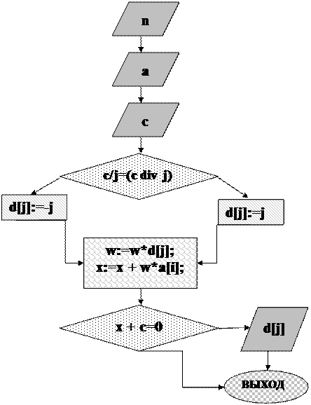 n – степень многочлена; a – коэффициент при x; c – свободный член уравнения; d – делитель свободного члена; w – вспомогательная переменная для возведения d в степень аргумента; x – сумма возведенных d в степень аргумента умноженных на a program matan_1; uses crt; var i,n,c,j,k,x,w,q,p:integer; a,d:array[1..100] of integer; BEGIN writeln ('введите степень многочлена'); readln (n); for i:=1 to n+1 do begin if i=n+1 then begin writeln ('введите свободный коэффициент'); read (c);end; if i<>n+1 then begin Writeln ('введите коэффициент при x^',n-i+1); readln (a[i]); end;end; w:=1; for j:=1 to c do begin if c/j= (c div j) then begin d[j]:=-j; k:=n; for i:=1 to n do begin for q:=1 to k do w:=w*d[j]; x:=x+w*a[i]; k:=k-1;w:=1;end; if x+c=0 then begin p:=p+1; writeln('целый корень уравнения =',d[j]);end; end; x:=0;end; for j:=1 to c do begin if c/j= (c div j) then begin d[j]:=j; k:=n; for i:=1 to n do begin for q:=1 to k do w:=w*d[j]; x:=x+w*a[i]; k:=k-1;w:=1;end; if x+c=0 then begin p:=p+1; writeln('целый корень уравнения =',d[j]);end; end; x:=0;end; if p=0 then writeln ('данное уравнение в целых числах неразрешимо'); readln;readln; END. ПРОГРАММА №2 (Уравнения первой степени с двумя неизвестными) program matan_2; var p,q,t,n,i,k,x,y,w,r,s,d:integer; a,b,c:array[1..1000]of integer; BEGIN writeln('вв. при х'); readln(p); writeln('вв. при y'); readln(q); writeln('вв. c'); readln(t); if p<0 then x:=-p else x:=p; if q<0 then y:=-q else y:=q; n:=0;n:=0;k:=1; for i:=1 to 10 do begin if k<>0 then begin n:=n+1; for i:=n to n do begin a[i]:=x; b[i]:=y; c[i]:=x div y; x:=x-c[i]*y; k:=k+1;n:=0;r:=r+1; if (x<y) and (x<>1) then begin w:=y; y:=x; x:=w;end else k:=0; end; end;end; x:=p;y:=q; for i:=1 to r do begin a[i]:=x; b[i]:=y; c[i]:=x div y; x:=x-c[i]*y;a[i]:=1;b[i]:=1; if (x<y) and (x<>1) then begin w:=y; y:=x; x:=w;end; end; for i:=r downto 1 do begin b[r]:=0; b[i]:=c[i]*b[i]+a[i]; if i>1 then b[i-1]:=b[i]; if i>2 then a[i-2]:=b[i-1]; end; if (p*b[1]+q*a[1]+t)=0 then begin writeln('корни уравнения x=',b[1],'y=',a[1]); writeln ('все его решения будут содержаться в прогрессиях'); writeln('x=',b[1],'+',q,'*','t'); writeln('y=',a[1],'+',p,'*','t');end; readln; END. ЗАКЛЮЧЕНИЕ Сравнивая поведение и характер решений уравнений второй степени с двумя неизвестными в целых числах с поведением решений уравнений первой степени, мы можем установить одно весьма существенное обстоятельство. Именно, если решения уравнения первой степени, когда они существуют, образуют арифметические прогрессии, то решения уравнения второй степени, когда их имеется бесконечно много, берутся из конечного числа обобщенных геометрических прогрессий. Другими словами, в случае второй степени пары целых чисел, которые могут быть решениями уравнения, встречаются значительно реже, чем пары целых чисел, которые могут быть решениями уравнения первой степени. Это обстоятельство не случайно. Оказывается, что уравнения с двумя неизвестными степени выше второй, вообще говоря, могут иметь только конечное число решений. Исключения из этого правила крайне редки. СПИСОК ЛИТЕРАТУРЫ: 1. Гельфонд А.О. Решение уравнений в целых числах. -4-е изд. – М.: Наука, 1983. – 64 с. – (Популярные лекции по математике). |