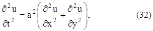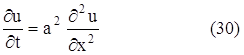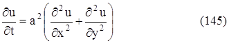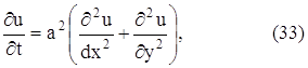- уравнение распространения тепла на плоскости. Если рассматривается распространения тепла в плоской области D с границей С, то граничные условия, аналогично (143) и (144), формулируются так: u (x, y, 0) = φ (x, y), u(М, t) = ψ (М, t), где φ и ψ – заданные функции, М – точка границы С. Если же функция u не зависит ни от z, ни от y, то получаем уравнение
