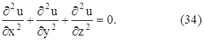 К исследованию этого уравнения приводит рассмотрение задач об электрических и магнитных полях, о стационарном тепловом состоянии, задач гидродинамики, диффузии и т. д. Это уравнение является простейшим уравнением эллиптического типа. В уравнениях (29), (30) и (31) искомая функция u зависит от двух переменных. Рассматриваются также соответствующие уравнения и для функций с большим числом переменных. Так, волновое уравнение с тремя независимыми переменными имеет вид: