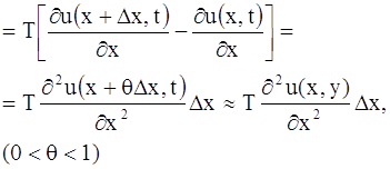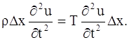 (здесь мы применили теорему Лагранжа к выражению, стоящего в квадратных скобках). Чтобы получить уравнение движения, нужно внешние силы, приложенные к элементу, приравнять силе инерции. Пусть ρ – линейная плотность струны. Тогда масса элемента струны будет ρ ∆х. Ускорение элемента равно ∂2u / ∂t2. Следовательно, по принципу Даламбера будем иметь: