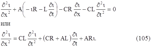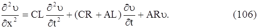 Уравнения (103) и (104) принято называть телеграфными уравнениями. Из системы уравнений (103) и (104) можно получить уравнение, содержащую только искомую функцию ί(x, t), и уравнение, содержащее только искомую функцию υ (x, t). Продифференцируем члены уравнения (104) по х; члены уравнения (103) продифференцируем по t и умножим их на С. Произведя вычитание, получим: