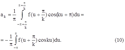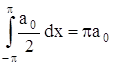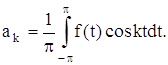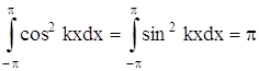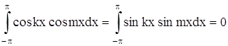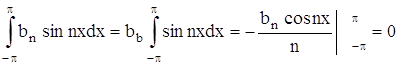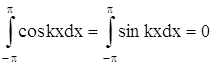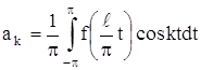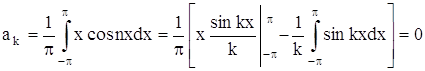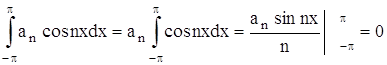 Теперь можем вычислить коэффициенты Фурье ak и bk ряда (2). Для разыскания коэффициента an при каком-либо определенном значении n≠0 умножим обе части равенства (2) на cosnx и произведя математические операции в пределах от –π до π, получим: