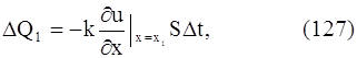 где n – единичный вектор, направленный по внешней нормали к поверхности S. Очевидно, что формула (136) дает количество тепла, поступающего в объем V (или уходящего из объема V) за время ∆t. Количество тепла, поступившего в объем V, идет на повышение температуры вещества этого объема. Рассмотрим элементарный объем ∆υ. Пусть за время ∆t его температура поднялась на ∆u. Очевидно, что количество тепла, затраченное на это повышение температуры элемента ∆υ, будет равно