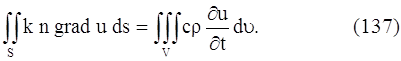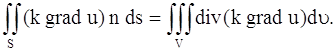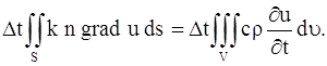 Подставляя выражение ∆Q = -k n grad u ∆s. Количество тепла, протекающего за время ∆t через площадку ∆s, будет равно: ∆Q∆t = -k n grad u ∆t ∆s. Вернемся к поставленной задаче. В рассматриваемой среде выделим малый объем V, ограниченный поверхностью S. Количество тепла, протекающего через поверхность S, будет равно: