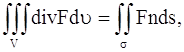 Поверхностный интеграл, стоящий в левой части этого равенства, преобразуем по формуле Остроградского (в векторной форме, где F – дивергенция векторного поля, σ – замкнутая поверхность)