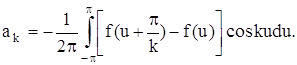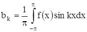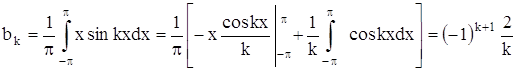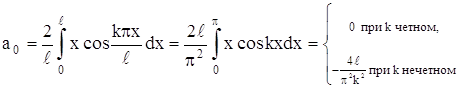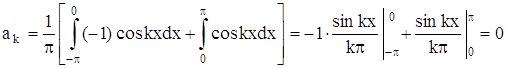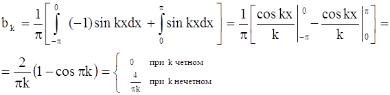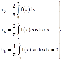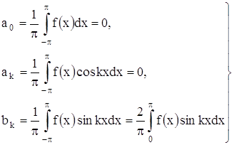 т. е. ряд Фурье нечетной функции содержит «только синусы». Если в ряд Фурье разлагается четная функция, то произведение ƒ(x) · sinkx есть функция нечетная, а ƒ(x) · coskx – четная, то: