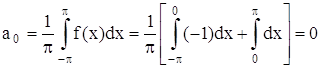 Это равенство имеет место во всех точках, кроме точек разрыва. В каждой точке разрыва сумма ряда равна среднему арифметическому ее пределов справа и слева, т. е. нулю. Пример 2. Периодическая функция ƒ(x) с периодом 2π определена следующим образом: ƒ(x) = -1 при –π < x < 0, ƒ(x) = 1 при 0 ≤ x ≤ π. Эта функция кусочно монотонна и ограничена на отрезке [-π, π]. Вычислим ее коэффициенты Фурье: