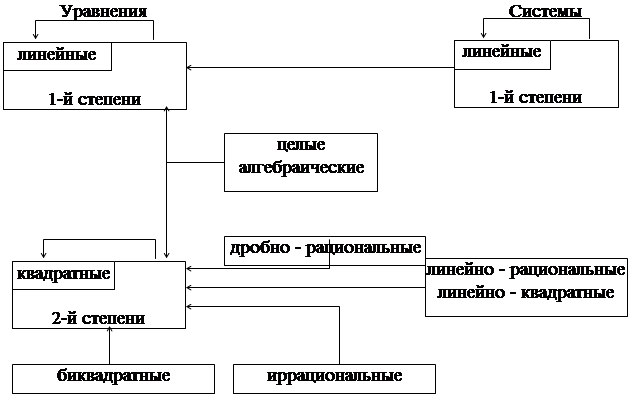 содержащей: а) целое уравнение, полученное из данного умножением на общий знаменатель Q (x); б) неравенство, характеризующее область определения дроби; 5) решить полученную систему; 6) если нужно, сделать проверку; 7) записать ответ. Программа по математике IX класса предусматривает знакомство и с некоторыми общими для всех видов уравнений приемами преобразования уравнений к простейшим (разложение левой части на множители и введение вспомогательной переменной), графическим способом решения уравнений, решения систем уравнений второй степени, решения задач с помощью систем уравнений на примерах. Нетрудно заметить, что разложение левой части на множители и введение вспомогательной переменной служит очередным расширением «фонда» преобразований уравнений к простейшим. Тогда к концу изучения курса алгебры неполной средней школы обобщенный прием алгебраического решения уравнений может иметь следующий вид: 1) определить, является ли данное уравнение простейшим уравнением какого-нибудь вида; если «да», выполнять п. 4, если «нет» — п. 2 ; 2) установить, какие и в каком порядке нужно выполнить тождественные и равносильные преобразования, чтобы привести уравнение к простейшим данного вида: раскрытие скобок, приведение к общему знаменателю, перенесение членов из одной части в другую, приведение подобных, разложение левой части на множители, введение вспомогательной переменной, возведение обеих частей в степень, замена уравнения равносильной ему системой уравнений; 3) с помощью выбранных преобразований привести уравнение к простейшим; 4) решить известным способом простейшее уравнение; 5) если нужно, сделать проверку, исследование; 6) записать ответ. Последняя ступень в освоении школьной теории уравнений относится к организации имеющихся у учащихся знаний и опыта решения уравнений в единую, целостную систему. Для этой ступени характерны более сложные задания, в которых возрастает роль таких компонентов, как распознавание возможности сведения задания к одному из типовых классов, организация процесса решения. Здесь существенно производить разбор решаемых заданий, выделять особенности различных классов заданий и их общие черты, отмечать ценность тех или иных применяемых средств. По своему положению в курсе алгебры эта ступень может быть отнесена к прохождению последних тем курса и к итоговому повторению; в результате формируется общая картина связей изученных классов уравнений, неравенств и их систем. Для уравнений и систем уравнений ее можно изобразить в виде схемы