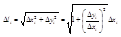 Определение: Пусть дана дуга кривой АВ. Нанесем на нее произвольные точки Mi (i=0,n) и соединим их хордами (рис 3). Периметр полученной ломаной обозначим Pn. Будем увеличивать число точек Mi на дуге. Длиной дуги кривой АВ называется предел периметра Pn, когда длина наибольшей хорды стремится к нулю (если этот предел существует и не зависит от выбора вершин ломаной). Если дуга задана уравнением y=f(x) на промежутке [a,b] (ищем длину дуги l). Будем считать функцию f(x) непрерывно дифференцируемой. Положенеи произвольных точек Mi определим выбрав абциссы этих точек, т.е. сделав разбиение R отрезка [a,b] точками а=х0< x1< x2<…< xn=b. Длину хорды, соединяющей точки Mi и Mi+1 обозначим ∆li.Ее проекциями на оси координат будут ∆хi ∆уi. Очевидно,
