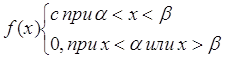 Пример 3. Поезда метрополитена идут с интервалом 2 мин. Пассажир выходит на платформу в некоторый момент времени. Время Т, в течении которого ему придется ждать поезда, представляет собой случайную величину, распределенную с равномерной плотностью на участке (0,2) минут. Рассмотрим случайную величину X, подчиненную закону равномерной плотности на участке α до β (см.Рисунок №2), и напишем для нее выражение плотности распределения f(x). Плотность f(x)постоянна и равна с на отрезке (α,β);