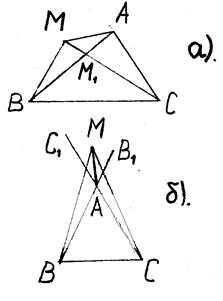 Рис.1. Отсюда 2(NА + NВ + NС) < АМ + ВМ + СМ + АМ1 + ВМ1 + СМ1 , или NА + NВ + NС < АМ + ВМ + СМ. Итак, точка N имеет сумму расстояний, меньшую, чем точки М и М1, что противоречит допущению. ● (Это доказательство дано Н. М. Соловьевым). Утверждение 2. Точка Торричелли не может лежать вне треугольника. Предположим, что искомая точка М лежит вне треугольника и расположена так, как указано на рис. 2а.