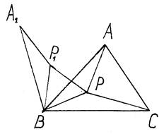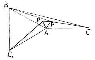 Рис. 5 Построим равносторонние треугольники РАР1 и АВС1. ∆АВР = ∆АР1С1 (АР = АР1; АВ = АС1; ÐРАВ = ÐР1АС1). Следовательно ВР=Р1С1; поэтому РС + РА + РВ = РС +РР1 + Р1С1 и далее РА + РВ + РС > АС + АС1; РА + РВ + РС > АС +АВ. Задача о нахождении точки Торричелли решена. Литература. 1. Радемахер Г., Тенлиц О. Числа и фигуры. – М.: Физматгиз, 1962. – С. 22 – 29. 2. Болтянский В. Г., Яглом И. М. Геометрические задачи на максимум и минимум//Энциклопедия элементарной математики. Т. V. – М.: Наука, 1966 3. Брокгауз Ф_А_, Ефрон И_А_ Энциклопедический словарь -Москва Высшая Школа 1986. |