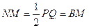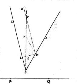 Делим ВА пополам в точке М; проводим линии Возьмём теперь нашу линейку и приспособим её к уже полученной фигуре так, чтобы точка Р линейки лежала на прямой КМ, точка Q лежала бы
