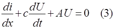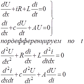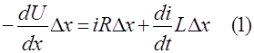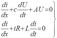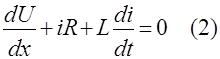 где R и L –сопротивление и коэффициент индуктивности рассчитанные на единицу длинны провода. Знак минус взят потому, что ток течёт в направлении, обратном возрастанию U.Сокращая на ∆Х, получим уравнение