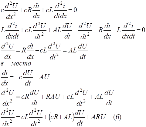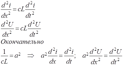 Если можно пренебречь утечкой через изоляцию (А=0) и сопротивлением (R=0), то уравнения (5) и (6) переходят в волновые уравнения: