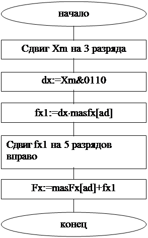 Формулы для вычисления погрешностей: - полной e = Fэт(х) - Fm(xm)/Mf - методической eм £ ((D xn-s)m-1/(m+1)!)*F(m+1)max - вычислительной eв = Fэт* - Fm(xm)/Mf 5. Расчет параметров алгоритма Одной из задач проектирования алгоритмов таблично алгоритмических методов является удовлетворение требований по времени вычисления элементарной функции в микроЭВМ и точности вычислений, которая обусловлена заданной разрядностью представления аргумента. Требование по времени tдоп можно выполнить, ограничивая такие параметры численных методов как число членов ряда, полинома, цепной дроби, шагов итераций и т. п. При этом учитывается время выполнения в микро-ЭВМ арифметических, логических и других используемых операций. Необходимая точность вычислений обеспечивается путем выполнения баланса методической и вычислительной погрешностей алгоритма в виде условия eм = eв где в качестве eв выступает ее минимальное значение 2-(n+1). В случае разложения в ряд Тейлора баланс погрешностей имеет вид: ((D xn-s)m+1/(m+1)!)*|F(m+1)max| = 2-(n+1) Учитывая что D xn-s = 2-s имеем: S ³ (n + 1 - log2((m+1)!)/|F(m+1)max|)/(m+1) Для большинства элементарных функций зависимость s(m) хорошо аппроксимируется соотношением: S ³ (n + 1 – 2m*log2e)/(m+1) Следовательно, по известной разрядности аргумента n и количеству членов ряда m можно оценить минимальную разрядность s старшей части аргумента X, обеспечивающую требуемый баланс методической и вычислительной погрешностей. В случае использования кусочно-линейной интерполяции баланс погрешностей имеет вид: (D xn-s|D xn-s – h|/2)*|F(2)max| = 2-(n+1) Поскольку h=2-s, то левая часть этого неравенства достигает максимального абсолютного значения при D xn-s = 2-(s+1).Тогда 2-2s *|F(2)max|/ 8 = 2-(n+1) Отсюда окончательно получаем: S ³ (n + log2|F(2)max| - 2)/2 Величина s является тем параметром, который обеспечивает баланс методической и вычислительной погрешностей, а также определяет не только разрядность старшей части аргумента Х, но и значение шага таблицы h = 2-s и количество табличных значений функции F(xs) равное 2s. 5.1. Расчёт величины S и h y=sh(x) - исходная функция Найдем первую и вторую производную y y'=ch(x) у''=sh(x) |f'max| = 1.128 |f''max| = 0.521 Зная |f''max| найдем s и h S ³ (n + 1 - log2((m+1)!)/|f(m+1)max|)/(m+1) , где n = 8 и m =1 Вычисляя получим s = 4