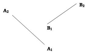 Эти отрезки не пересекаются. Для достаточного доказательства пересечения отрезков необходимо произвести все вышеприведенные операции над точками B1 и B2, т.е. провести через них прямую и выяснить расположение точек A1 и A2 относительно ее. Таким образом определяем возможность отсечения вершины многоугольника с количеством вершин, больше четырех. Для некоторых видов четырехугольника это условие не несправедливо, например: