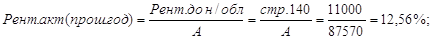 16. Рассчитаем и проанализируем рентабельность активов организации и ее динамику. Определим влияние факторов (рентабельности продаж, оборачиваемости собственного капитала, коэффициента автономии) на изменение рентабельности активов в отчетный год в сравнении с предшествующим годом. Расчеты представим в таблице 14. Рентабельность активов составила в прошлом году 12,56 % и на отчетный год выросла на 0,09, и стала составлять 12,65 %.Рассмотрим влияние факторов на изменение рентабельности активов: (3) Среднегодовая выручка собств. капитала: СК= (НачГода(стр.490+640+650)+КонГода(стр.490+640+650)):2 = 47325 тыс.руб. (5) Рентабельность активов(%):