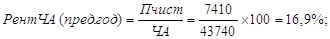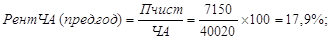 Рентабельность собственного капитала за отчетный год снизилась на 0,002 %. В результате увеличения оборачиваемости активов рентабельность собственного капитала выросла на 0,132 %. Снижение рентабельности продаж привело к снижению рентабельности собственного капитала на 0,07 %. 18. Используя данные таблицы 16, рассчитаем влияние рентабельности чистых активов за отчетный год по сравнению с предыдущим годом. Рассчитаем рентабельность чистых активов: