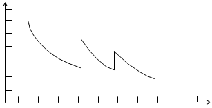 Капиталовложения (остаточная стоимость) Годы Рис. 4.13. Линейная амортизация. Б). Амортизация по остаточной стоимости. Ряд экономистов утверждает, что стоимость основного капитала особенно сильно падает в первые годы его использования. Это легко показать на примере темпов амортизации, описываемых путем ежегодной амортизации определенного процента остаточной стоимости капитала (которая фиксируется в бухгалтерских документах). Пример. Первоначальная стоимость купленной машины с учетом расходов по доставке и установке составляет 600000 грв. Предположим, что ежегодные амортизационные списания составляют 30% от ее остаточной стоимости. Таблица 4.11. Амортизация по остаточной стоимости.