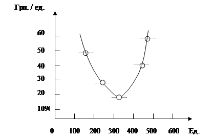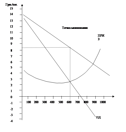 Рассчитанные в табл. 4.8 значения предельных издержек могут быть представлены графически (рис. 4.11). Кусочками пунктирной линии показано графическое изображение конкретных значений предельных издержек, приведенных в табл. 4.8. Из таблицы следует, что предельные издержки на все единицы продукции, лежащие в интервале от 0 до 100 шт., составят в среднем величину, равную 100 грн. На единицу продукции. На графике это показано пунктирной линией, лежащей в интервале от 0 до 100 по оси абсцисс при значении 100 грн. по оси ординат. На рис. 4.11 показаны предельные издержки. Изменение их величин показано сплошной кривой. Сами же предельные издержки в том интервале, в котором рассчитывается их величина, располагаются в виде точек. Полученная кривая, отражающая динамику предельных издержек, может быть названа кривой предельных издержек (ПРИЗ), которая приближается к кривой собственно предельных издержек (при наличии достаточной информации для точного ее расчета и графического отображения).