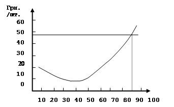Рис.5.1. Метод сопоставления валовых показателей на примере фирмы "А". Когда показатель объема производства и реализации находится правее точки нулевой прибыли (0-опр.), валовая выручка превышает издержки и появляется прибыль. Размер прибыли рассчитывается по величине расстояния между двумя кривыми по оси ординат. Оптимальный для фирмы объем производства и реализации (90000 шт.) и соответствующая ему прибыль (4320000 грн. – 3180000 грн.) показаны пунктирными линиями. Фирма “A” имеет неизменными постоянные издержки, что дает возможность рассчитать величины покрытия при различных показателях объема производства. Объем производства, при котором достигается наивысшая величина покрытия и соответственно наивысшая прибыль, является оптимальным. 5.2. Метод сопоставления предельных показателей. При оптимизации объема производства и реализации с помощью метода сопоставления предельных показателей используются категории предельные издержки и предельный доход. До тех пор пока величина предельного дохода (дополнительного дохода на единицу продукции) превышает величину предельных издержек (дополнительных издержек на единицу продукции) увеличение производства и реализации рентабельно. На основании величин валовых издержек при различных показателях объема производства и реализации, характеризующих деятельность фирма “A” (табл.5.1), могут быть исчислены величины предельных издержек (ПРИЗ) – колонка 3 табл.5.3. Предельный доход (ПД) при различных показателях объема производства и реализации остается одинаковым и равняется рыночной цене в 48 грв. за единицу. Таблица 5.3. Метод сопоставления предельных показателей на примере фирмы "A".