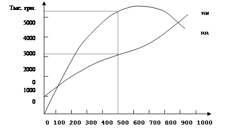5.4.1. Метод сопоставления валовых показателей. В табл. 5.6. величина валовой выручки при различных показателях объема производства и реализации (табл.5.5), рассчитана путем умножения цены на количество реализованной продукции. Прибыль предприятия определяется путем вычитания суммы валовых издержек из величины валовой выручки. В нашем случае производство приносит прибыль при различных показателях его объема. Расчеты, приведенные в табл.5.6., показывают, что при цене 9 гривен за 1 за шт. предприятие получает наибольшую прибыль, реализуя 600000 шт. товара "Б". На рис.5.3. дан пример графического сопоставления валовых показателей и обозначены приведенные в табл.5.6 величины валовой выручки (ВВ) и соответствующие им величины валовых издержек (ВИ), тыс. гривен. Величина прибыли исчисляется на оси ординат и равняется расстоянию между соответствующими точками обеих кривых по вертикали. При объеме реализации 600000 шт. товара "Б" (по 9 грн. за шт.) предприятие получает максимальную прибыль (5400000 – 3025000 = 2375000 грн.). В связи с тем, что постоянные издержки в примере с товаром "Б" неизменны, вместо определения прибыли при различных показателях цены и объема производства можно было бы выполнить исчисление величины покрытия. При показателях цены и объема производства, которые обеспечивают наибольшую величину покрытия, достигается наибольшая прибыль. Таблица 5.6. Объем производства (и реализации) и издержки на примере товара “Б”.